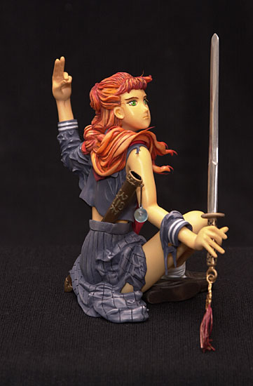 | 今回の仕上げは、原画イラストを意識して、グラデーションを濃い目にしてみました。ですがアニメ設定と違い、刀(水愚刀)のデザインが違い過ぎるので、どちらに合わすか迷いましたが、原画イラストに合わせる事にしました。(アニメ設定は派手) パーツ点数は約30点、結構細かいパーツも有り、跳ね髪等は一部、購入した人に作ってもらう形になるところもあります。パーツ合わせはかなり良くなったと思います。(た、多分。) 一次原型が出来てから仕上げまで、半年も空いてしまった為に、ほとんど全てに改修の手が入りました。(時間が経てば、見方も変わると言う事ですね〜。) このキャラクター、私個人の意見ではありますが『特徴がない!』つまり、参考資料を小説設定にするか、アニメ設定にするかでイメージがかなり変わります。今回は中間的にしましたが、アニメから入ってきた人が観たら『チョット違うんじゃない?』と思うかもしれません。今回は『イメージが伝わればいいかな』と思っております。 自分的には、イメージ通りに出来たつもりではありますが、次はもっと上手く表現出来る様に頑張ります〜。 |